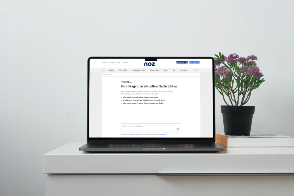 Nach umfangreichen Usability-Tests und einem erfolgreich abgeschlossenen Softlaunch wird der intelligente Assistent “frag noz” nun fest in das digitale Angebot auf www.noz.de integriert. Das System nutzt das Verfahren der sogenannten Retrieval-Augmented Generation. Das bedeutet: Die Künstliche Intelligenz greift gezielt auf das verifizierte Archiv der Redaktion als Wissensquelle zu. Das Besondere: Antworten werden nicht aus allgemeinen Internetdaten generiert, sondern basieren direkt auf der regionalen Berichterstattung.